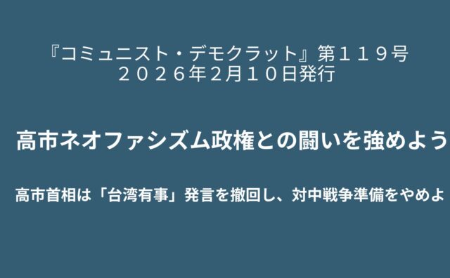 コミュニスト・デモクラット』第118号 2025年12月10日発行 目次(全60ページ)■トランプはベネズエラから手を引け ■ガザの植民地化ではなく、パレスチナの民族自決を ■《主張》高市軍国主義と闘おう■《特集》高市ネオファシズム政権と闘おう ・特集にあたって~対中反戦と人民生活防衛を結合して闘おう ・(解説)台湾は「核心的利益の核心」/両岸統一は中国人民の悲願 ・高市政権の軍拡と戦争国家化の...