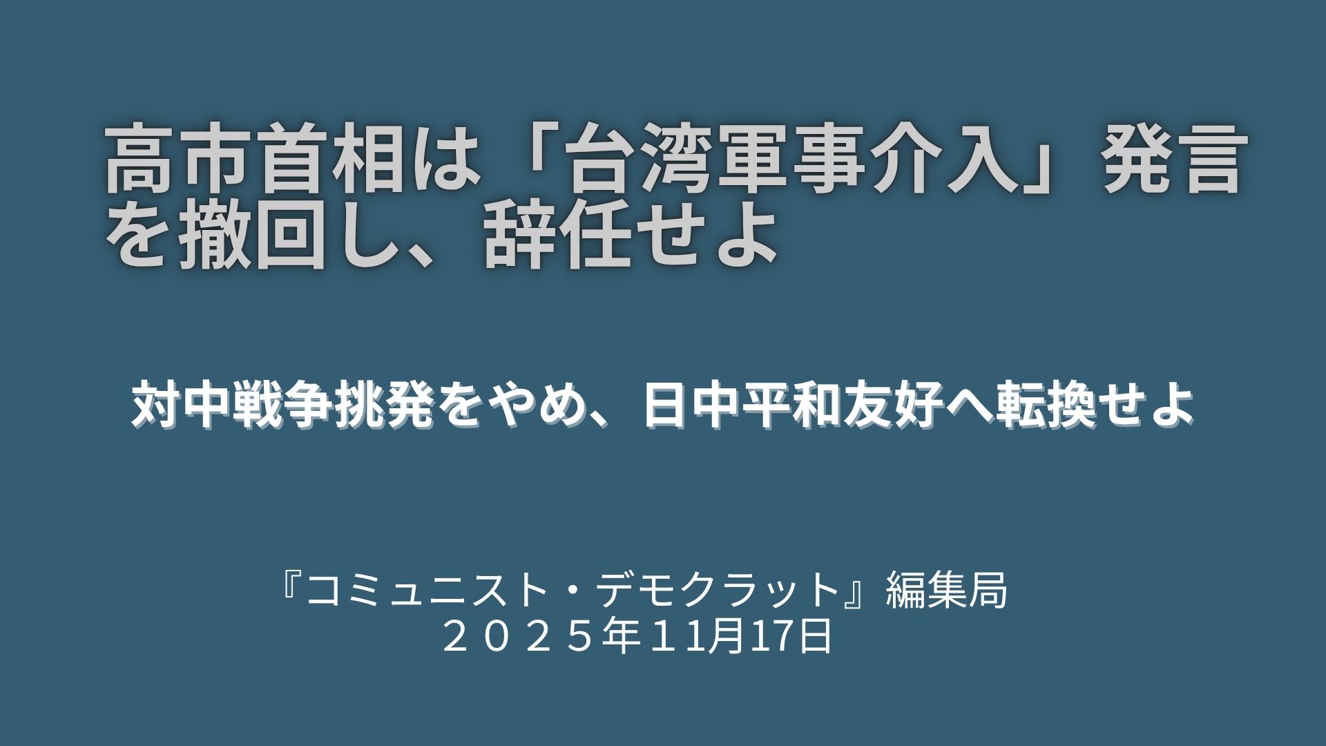 高市発言は明らかに歴史的な一線を越えた。台湾への武力行使を画策し、日中関係を根底から破壊し、交戦権を禁止した憲法を否定する人物を首相にとどまらせてはならない。われわれは、高市首相がただちに「台湾軍事介入」発言を撤回・謝罪し、辞任するよう強く要求する。