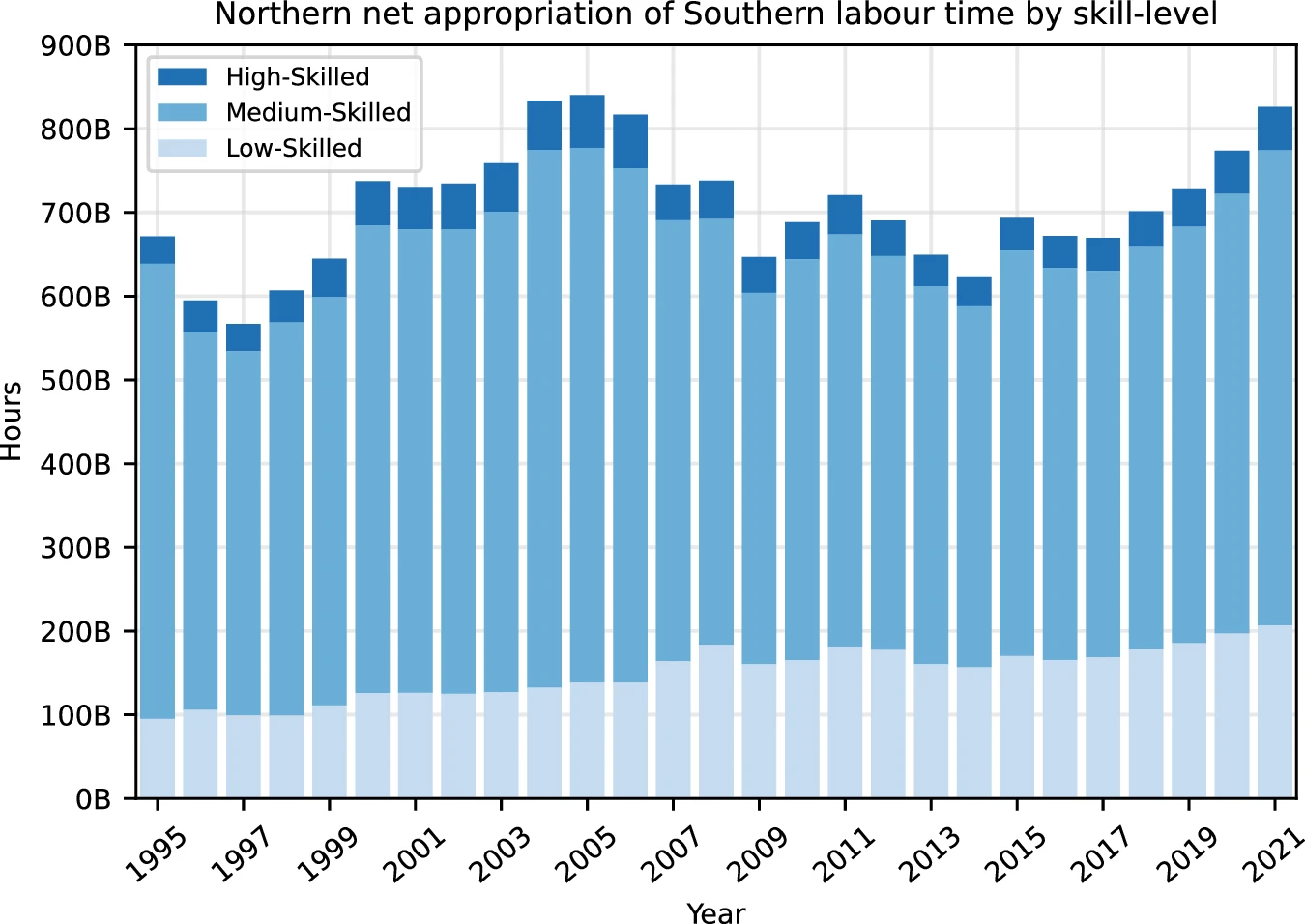 こうして筆者らは結論に入る。最終節「議論」の冒頭にその総括的記述がある。「国際貿易とグローバルサプライチェーンにおける不等価交換を通じて、あらゆるスキルレベルとすべてのセクターにわたって、南から北への具現化された労働の大規模な純移転が発生し、2021年には合計8260億時間に達したことを示している」。図3、図4の2021年の数字を参照。