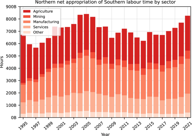 こうして筆者らは結論に入る。最終節「議論」の冒頭にその総括的記述がある。「国際貿易とグローバルサプライチェーンにおける不等価交換を通じて、あらゆるスキルレベルとすべてのセクターにわたって、南から北への具現化された労働の大規模な純移転が発生し、2021年には合計8260億時間に達したことを示している」。図3、図4の2021年の数字を参照。
