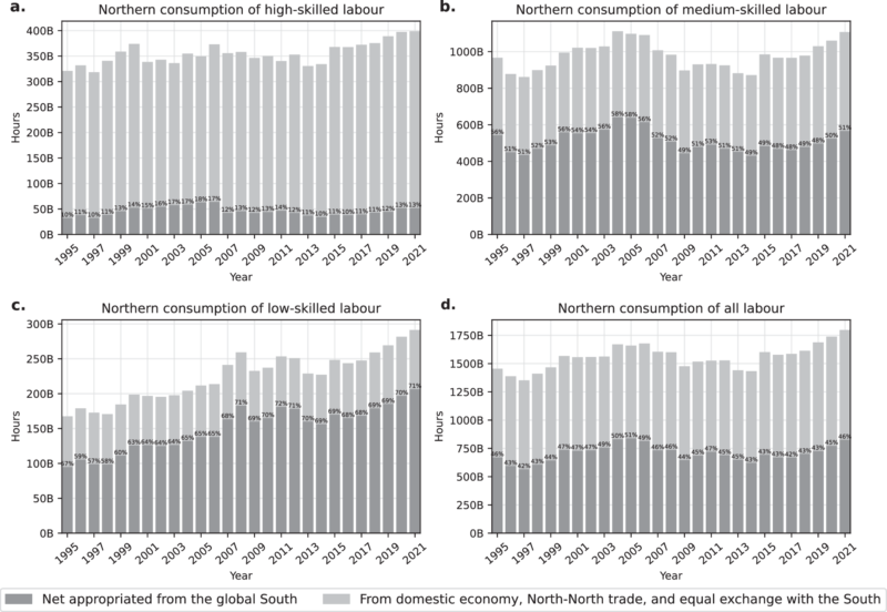 *濃い灰色は、南からの純収奪労働時間を表す。薄い灰色は、北で消費されたその他のすべての労働、すなわち家事労働、北間の貿易、南との等価交換による労働を表す。パネルaは高技能労働の消費、パネルbは中技能、パネルcは低技能である。パネルdは北における全労働の消費(a~cの合計)を示す。