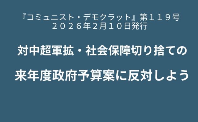 来年度予算政府案の審議が始まる。政府予算は高市政権が進める戦争国家化の財政的な裏付けであり、国家運営の階級的意志を集中的に表現する。国会内で野党の批判がますます弱まるからこそ、内容を徹底的に批判しなければならない。 その特徴は、「責任ある積極財政」「危機管理投資」を旗印に軍事予算の聖域化と拡大最優先、軍拡を経済成長と結びつける経済の軍事化、戦争国家化の促進、他方でそのための財源を社会保障費の抑制(...
